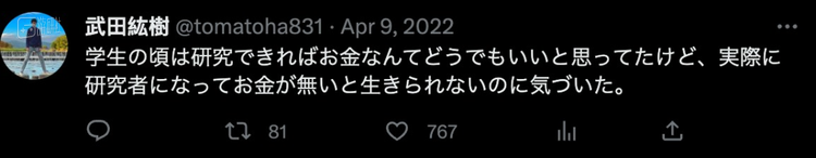 虽说平时忙于学术,但「武田紘樹」也时常使用社交媒体,在上面发发属于科研者的牢骚。譬如在前段时间,他还抱怨自己搞研究挣不到钱。