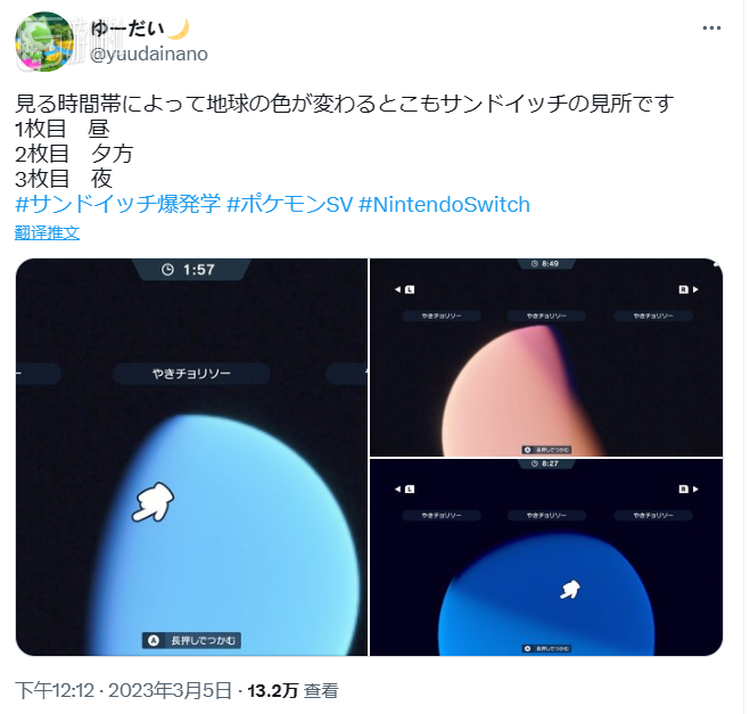 实际上三明治爆炸学并不是单纯的娱乐消遣,起码我们能借此一窥帕底亚地区所在星球的外貌,从前线调查员给出的情报来看,GameFreak似乎真的为这颗星球搭建了合理的昼夜系统,随着时间的推移,“地球”表面的颜色也会随之改变,早中晚三个时间段飞上太空都能有新的发现。