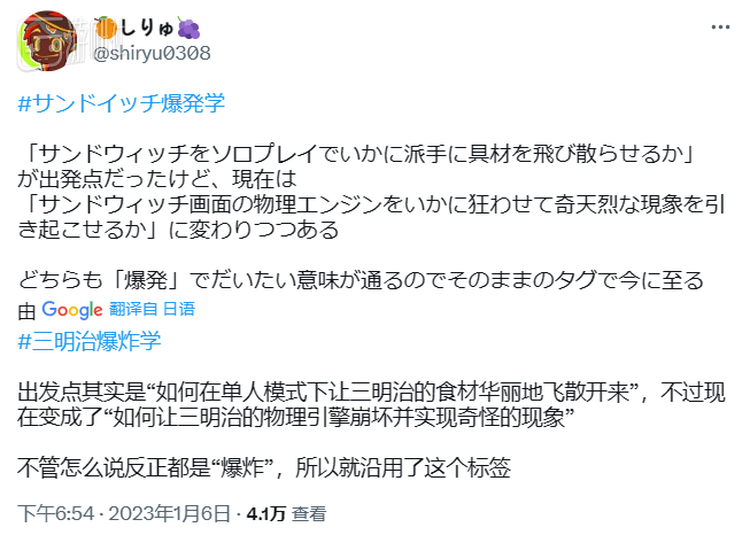 当时,部分玩家敏锐地察觉到了这套物理演算背后的潜力,如果能在《宝可梦 朱/紫》这个BUG遍地走的游戏里让三明治实现“艺术般的爆炸效果”,或许会异常有趣。抱着这样的想法,几位日本玩家开始了他们的“三明治爆炸学”研究,并在一遍又一遍的三明治制作过程中反复试错,寻找让三明治华丽四散的最佳方案。