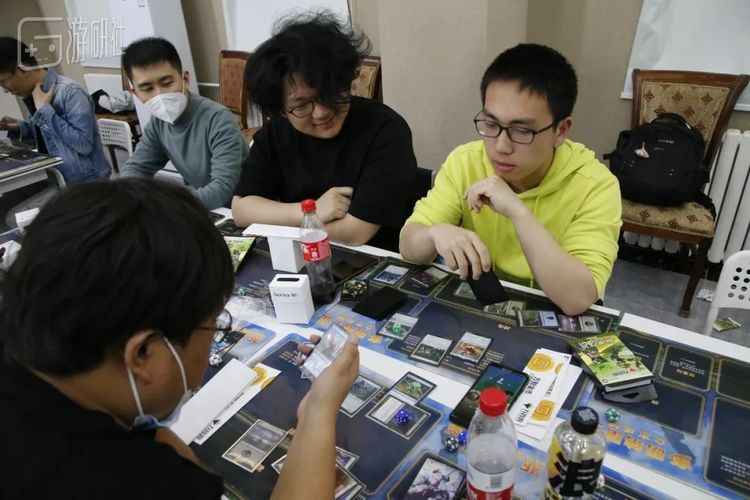 在我换完卡后,我和坐在我对面的一对姐弟(可能是)打了一把友谊赛。虽然一开始我占了优势,但是随着对局的继续进行,形势急转直下。正当我快要输掉这场比赛时,活动正式开始了,友谊赛也随之结束。经过简单的规则讲解,我们开始自由对决。于是,我抓起骰子,与周围的牌友们告别,起身前往大厅中央——那里可能有更强的对手。经过数次寻找,我找到了一个空座,对面是一位温文尔雅,比较平和的老哥,于是我便大胆提议进行一次对局。可能是因为对方牌友还不太熟悉规则,这次对局中我仍然处于上风。不过很可惜,由于我在下午三点半有些事,我只好在牌局进行到一半的情况下暂时离开活动场地。
