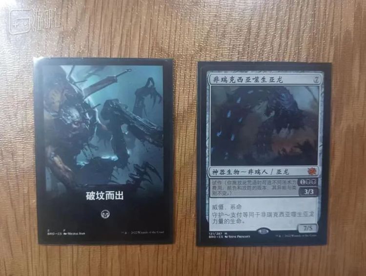 为了逆天改命,我决定充分发挥万智牌TCG的本能,化身社牛与其他牌友们整包换牌,组一套单色套牌。在与其他牌友的交流中,我了解到速战包中的大部分卡是固定的,但每包中除地牌外的最后一张卡是随机的,能否开出强牌全凭运气。而我就在“破坟而出”这包牌中开出了一张强力的卡牌:“非瑞克西亚噬生亚龙”。