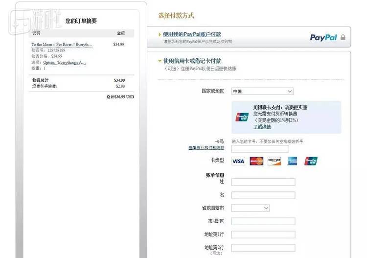 支付结算需要用到PayPal账户,如无账户或不愿注册也可以直接付款,需要用到一张信用卡或借记卡,支持银联、Visa、万事达、AE等多种结算方式。注意送货地址也是在这里填写的,可以直接写中文。如果账单地址和送货地址不一致,记得多填写一次送货地址。支付费用后,一般一周左右就会收到你心仪的商品了。