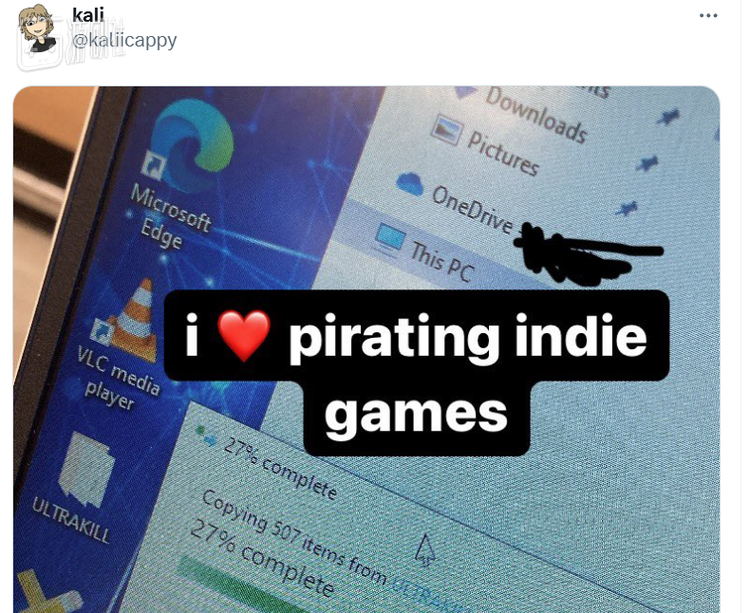 kali是推特上的一名普通网友,平日里她喜欢通过推特分享一些生活趣事和游戏内容。6月1日的时候,kali发布了一条推文,并配图“我爱盗版独立游戏”,而她正在拷贝的游戏文件,正是2020年发售的好评如潮的复古FPS游戏《ULTRAKILL》。