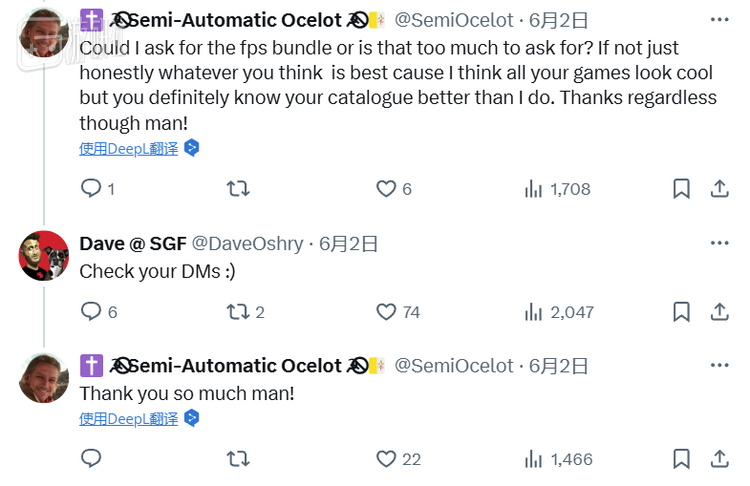 Dave Oshry的这番言论可不是在作秀,有位失业在家的老哥找上了他,想问问看这位讨厌钱的CEO能不能送自己一款免费的游戏,Dave Oshry也是二话没说,直接让对方查看私信。虽然咱也不知道Dave Oshry到底送了啥,不过根据两人的对话来看游戏确实是送出去了。