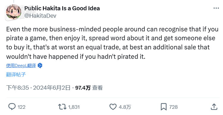 随后,Hakita也在商业层面针对盗版发表了一些个人见解:“即便是那些更加注重商业利益的人也能认识到,如果你玩了一款盗版游戏,非常喜欢,然后推荐给了其他人,而其他人购买了正版,那么最坏的情况这也是一笔平等的交易,最好的情况则是一次额外的销售,如果没有盗版游戏的话,这种情况根本就不会发生。”