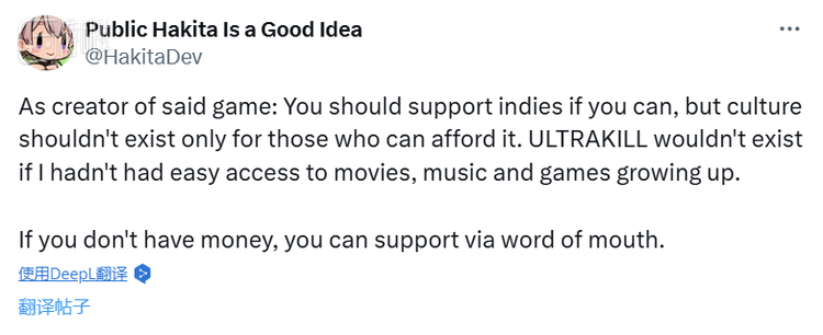 这事很快便传到了游戏开发者的耳朵里,第二天,《ULTRAKILL》的开发者Hakita转发了这条推文,并在推特上明确表达了他对于盗版的看法: