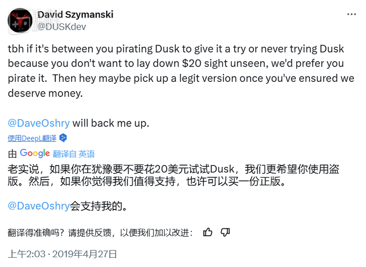 或许有人会觉得,《ULTRAKILL》是一款口碑销量双丰收的热门游戏,兼顾开发和发行的New Blood肯定也不缺这几份盗版的收入 。但早在2019年,《ULTRAKILL》尚未发售,New Blood的收入也不及今天这般时,他们的员工就已经在怂恿大家玩盗版了,这位叫做David Szymanski的开发者甚至还在宣传盗版的推文下面@了老板Dave Oshry,不难看出New Blood公司内部对待盗版的态度的确十分随意。