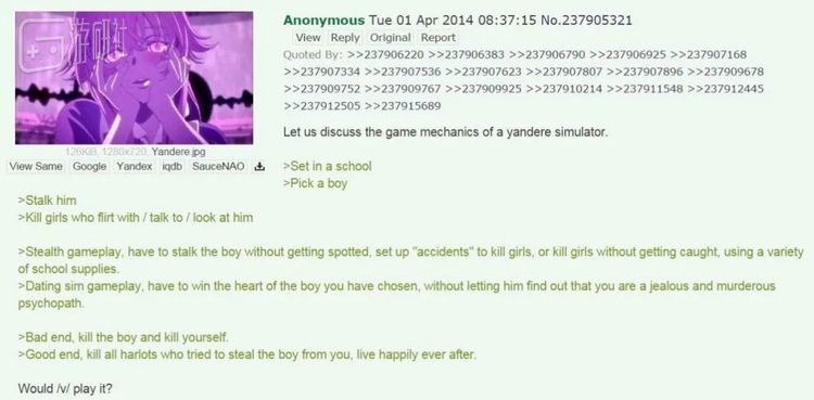 以互联网留存至今的信息来看,《病娇模拟器》的作者Alex Mahan(下文简称Alex),于4月1日当天在4chan论坛的游戏板块里构建了游戏的雏形。他将自己心中那款模拟病娇的游戏,以文字的形式描绘了出来:潜行尾随玩法、约会恋爱模拟、游戏还分为两个结局,分别是自杀BE和独占HE……