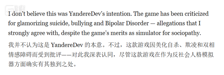 长期浸淫于4chan论坛的Alex压根没想过自己的游戏原来还能跟“美化自杀”扯上关系,他认为自己只是把二次元作品中常见的病娇角色做成了游戏而已。当然,主流舆论对于《病娇模拟器》的批判,很大程度上也受到了那个年代抵制校园暴力题材的社会思潮所带来的影响。