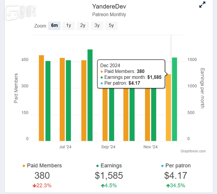 在付费订阅平台Patreon上,Alex靠着《病娇模拟器》作者的身份,每个月都能收获忠实粉丝的订阅赞助。哪怕是人气连年下跌,在2023年爆出“与未成年人调情”的丑闻之后,整个2024年Alex仍能通过Patreon获得1500美元/月。要是再算上过往10年里他的油管视频变现能力以及Twitch直播的礼物收入,Alex在《病娇模拟器》从未正式发售的情况下,也已经赚到了一大笔钱。