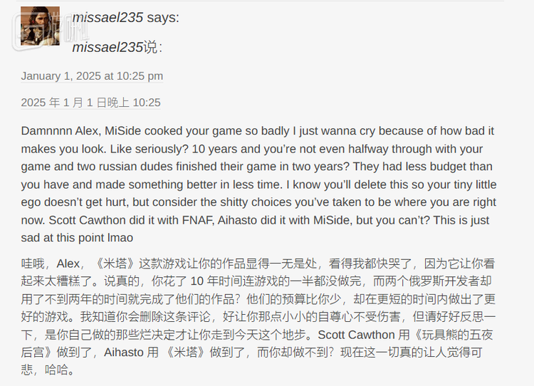《米塔》发售后,也有一些玩家拿着这款游戏的成绩单跑来质问Alex:“看看人家做得又快又好,你真的不会感到羞愧吗?”