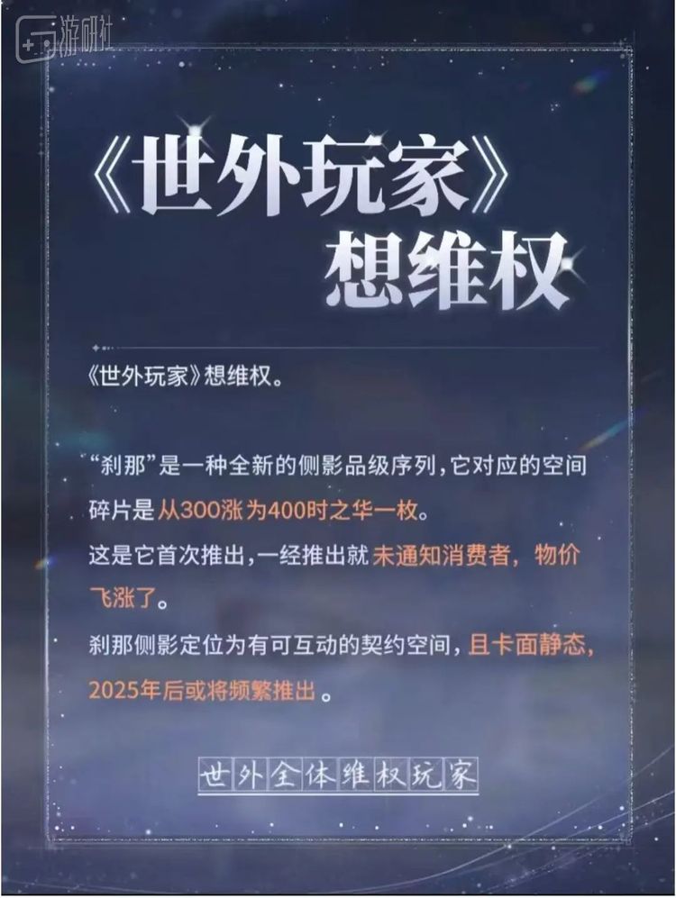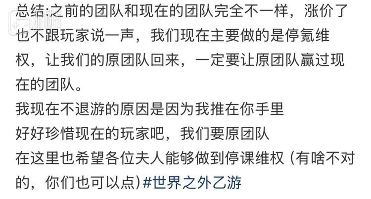 而最近这次矛盾的起点,直白来说确实就是钱:《世界之外》的新卡池时增加了更高的品级,单抽价格上调了三成多,并且未提前公告。也因此,尽管并没有切实证据,但世外玩家社区中却开始盛传“游戏团队换人”的消息。