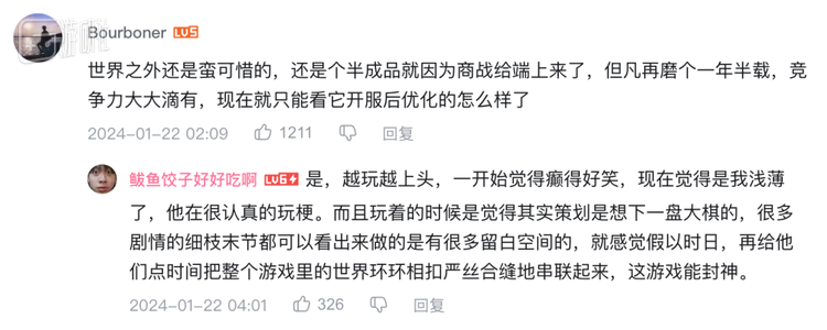 这种心态并非个例,在《世界之外》的玩家间,“做大做强”与游戏疑似“被砍”的前史编织在了一起,让项目组从那时起就立下了一个“一无所有、靠自己争取、不怕丢人”的真诚人设,让玩家更有联结感,也更为宽容。
