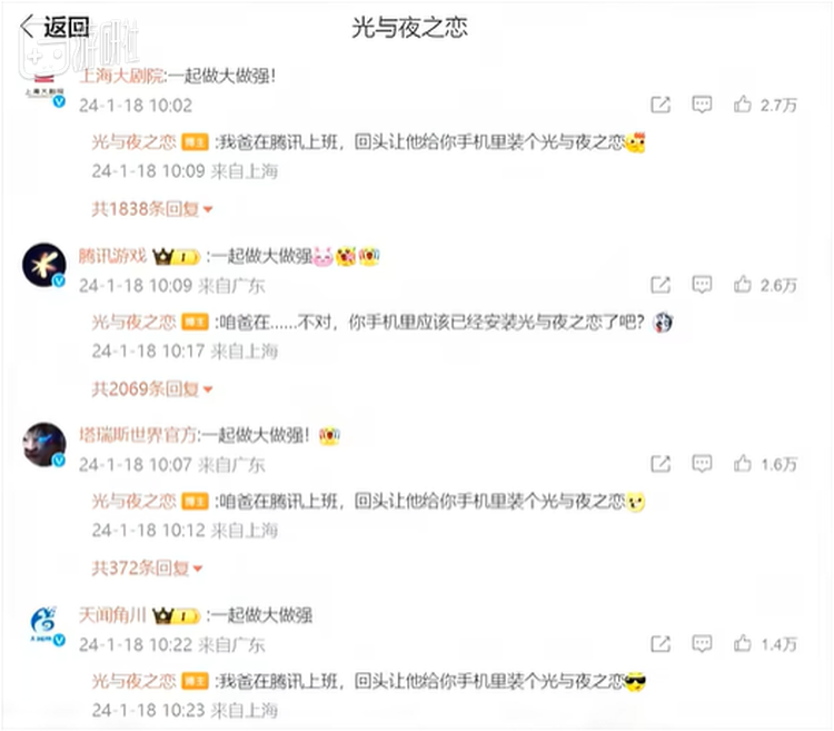 当时,《世界之外》的官方微博跑到了各大国乙的宣传微博底下,留下了一句“一起做大做强!”的评论。这句莫名其妙的口号,在最开始就透露出病毒式传播的潜质,一跃成为成为乙游玩家津津乐道的梗。