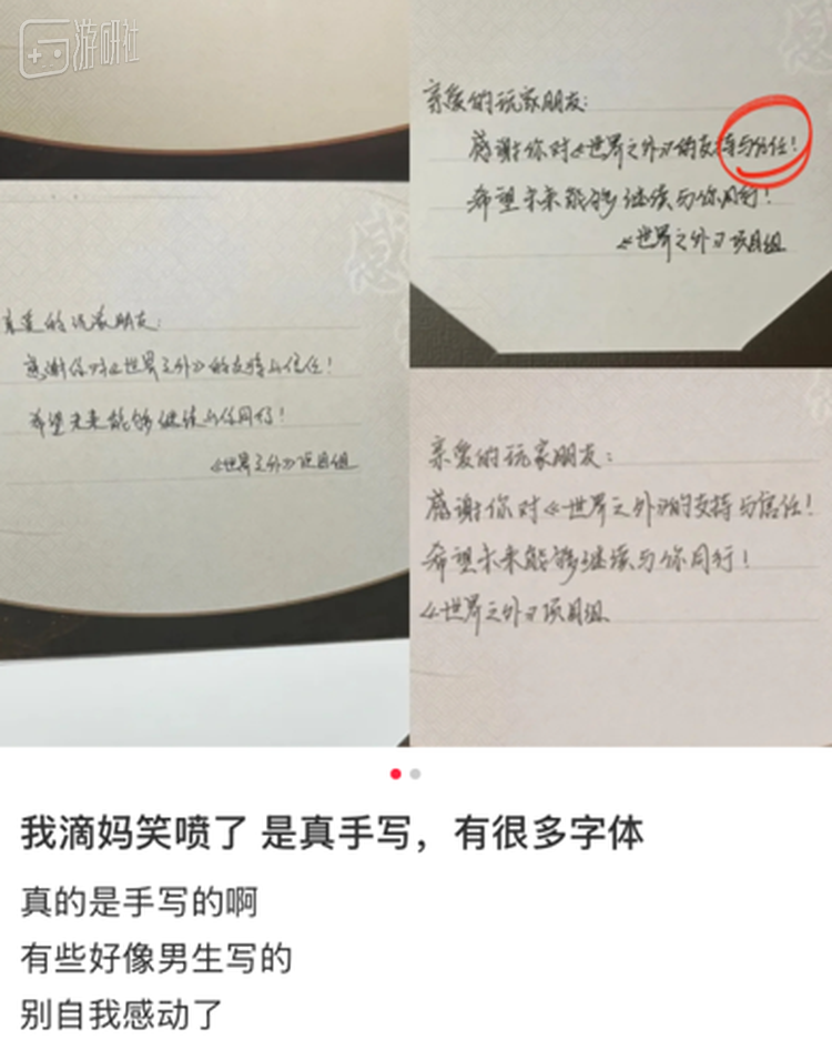 在最近给万氪玩家发出的VIP礼盒中,《世界之外》附上了一封手写信——好消息,从不同多样化的字体中,可以看出信确实是手写的,而不是打印手写体;坏消息,这封信不是以乙游男主名义写给玩家的,而是来自项目组。