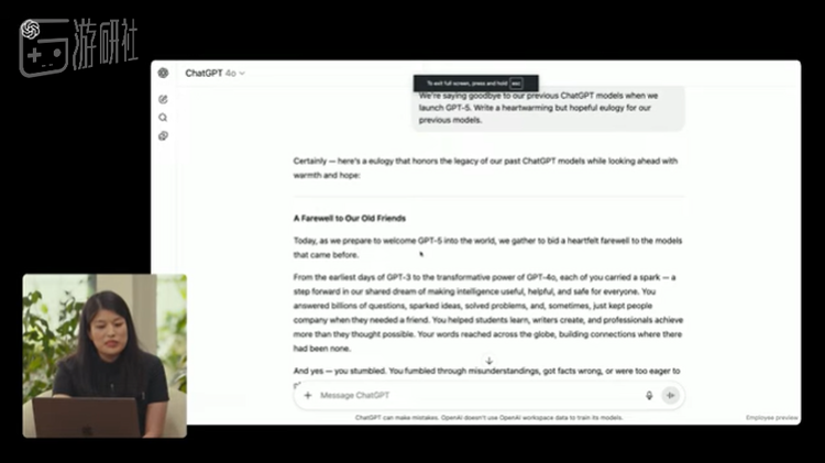 在GPT-5的发布会上,为展示写作能力,OpenAI设计了一个让4o和5为旧版模型写悼词的环节,这被一些怀念4o的用户解读为“没人性”