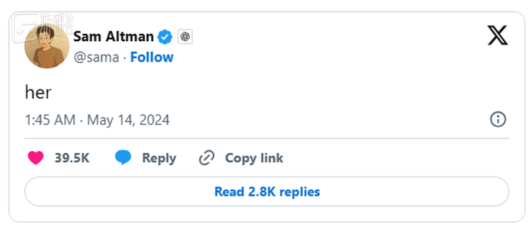 到了2024年,GPT-4o发布,有了更自然的实时语音与情感化对话能力,Altman在这个节点上发了一条简洁的推特,再次直指电影《她》,之后还因4o的声线之一Sky与电影主演斯嘉丽·约翰逊过于相似而卷入争议。