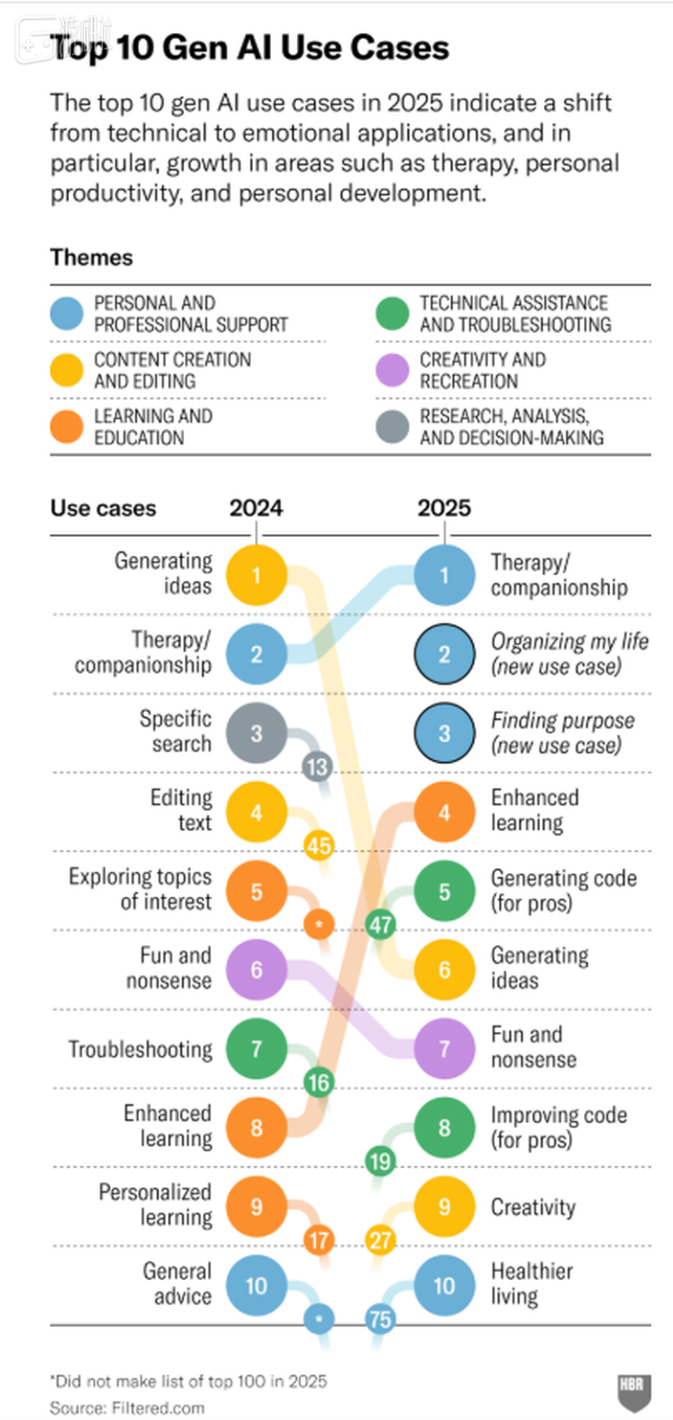 今年4月,《哈佛商业评论》就AI实际应用场景的变化发布了一篇调研。其中提到,心理治疗/陪伴已经一跃成为了使用率最高的场景——其中既包括了处理心理问题,也包括而持续的情感互动。紧随其后的,是“梳理个人生活”和“寻找人生意义”。