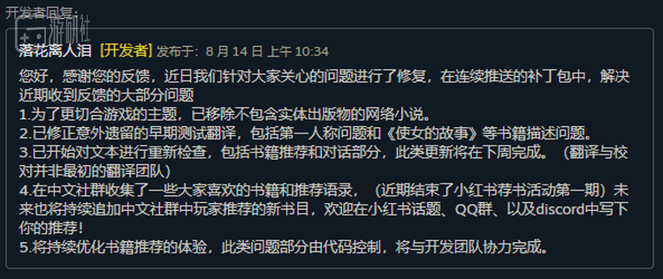 面对这些反馈,游戏及时做出了相应的处理。因为快速的反应和诚恳的态度,《小小书店》在中文社群中口碑也有所回升。