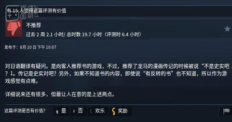 出于语言限制,我只浏览了Steam的评论,其中比较微妙的是,只有一位日语玩家留下了“为什么历史人物传记漫画不算史实”的困惑评论。