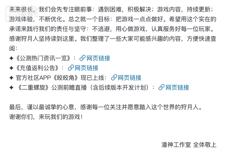 如公测前夕官方发布的动态所言,《二重螺旋》是潘神工作室第一款产品,但“第一款”这个标签不能成为任何问题的借口,也希望项目组能真正如他们所说做到:遇到困难,积极解决;游戏内容,持续更新;游戏体验,不断优化,把游戏一点点做好。也请各位玩家也不妨也多一些耐心与包容,也相信《二重螺旋》未来会不断提升品质、自我进步,给所有玩家带来更好更优质的游戏内容。