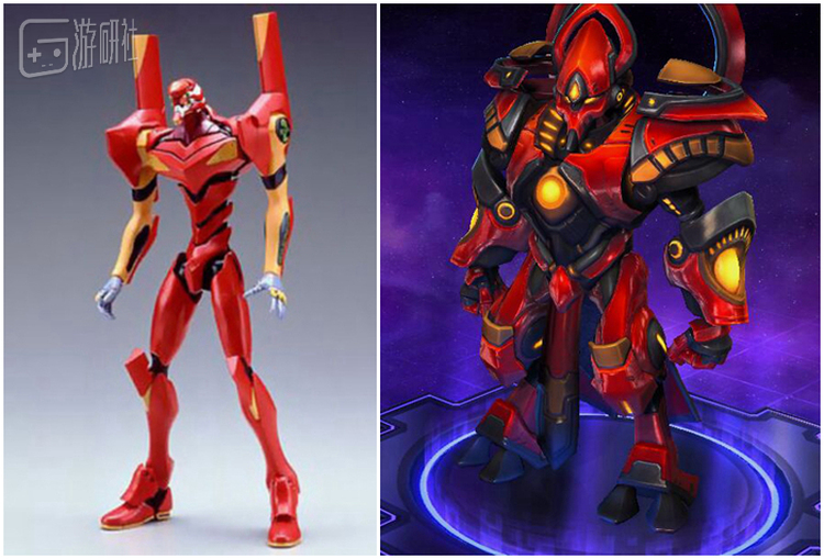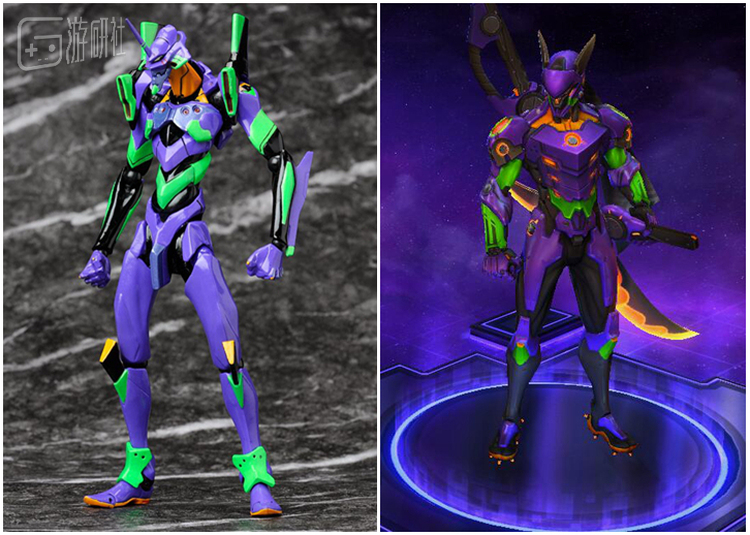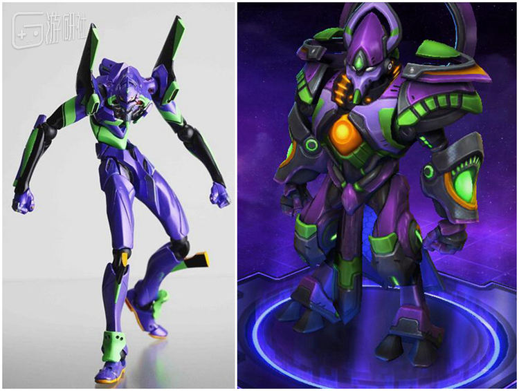 类似的配色还可以在来自《星际争霸》中的星灵英雄“阿塔尼斯”皮肤中找到。“测试模型净化者”与“猩红净化者”两款配色皮肤分别是紫绿与红橙搭配,正好对应了EVA初号机与二号机。只是阿塔尼斯微胖的身材和EVA机体纤瘦的体型还是有些差距。