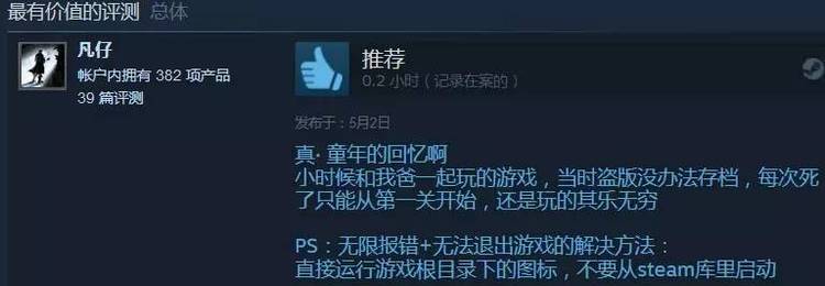 Steam上的用户评测也不例外,补票感言里各种回忆“爸爸领进门,修行靠个人”。总之,价低情怀高,当然前提是能有个一起打游戏的老爸。