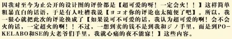 而横尾对美人鱼的评价是这样的:“因为之前我对设计图的评价都是‘超可爱的呀,一定会火!’这样简单粗暴的话,有人吐槽我说‘你也太随便了吧’。所以,我一狠心就把这次评论换成了‘如果说可不可爱的话,我认为超可爱啊!会不会火?一定超火啊!!但是,想到卖的钱不是到我和GINO手里,而是到Pokelabo和SE的老爷们手里,我就心疼得夜不能寝啊!’这些内容”。是不是很性情?