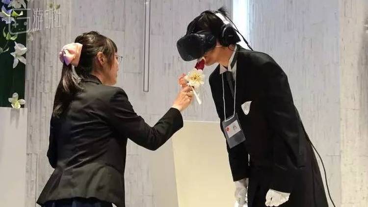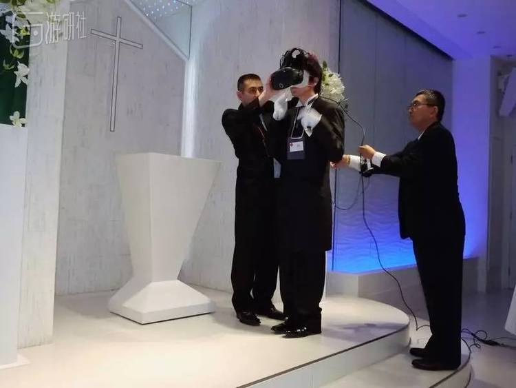 不仅只有一个人,脖子上还挂着胸牌,头上戴着VR头盔,这是6月30日在日本举行的一场VR婚礼,按照举办厂商的话来说,算是回馈用户的一次特殊体验,说起来有点小尴尬,这个VR体验是一款黄油的周边产品。