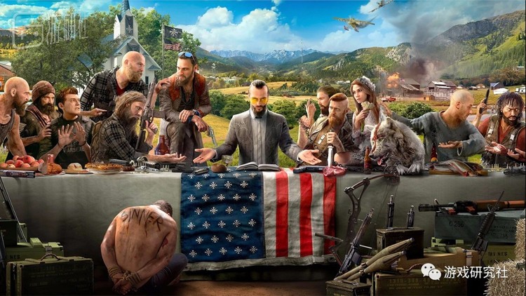 《孤岛惊魂5》最著名的海报,反派角色按照名画“最后的晚餐”的座次依次就坐,星条旗的五角星也被铁十字代替
