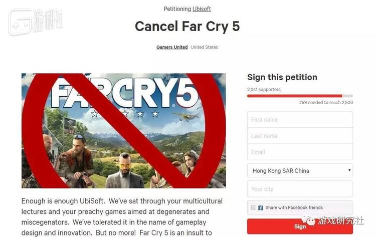 和国内的风平浪静相比,正在制作的《孤岛惊魂5》前些日子在国外掀起了一阵不大不小的风浪。有美国玩家在投票网站change.org上发起了“取消开发《孤岛惊魂5》”的投票。理由很简单:因为在这款游戏中,玩家要对付的敌人是信仰基督教的美国白人。