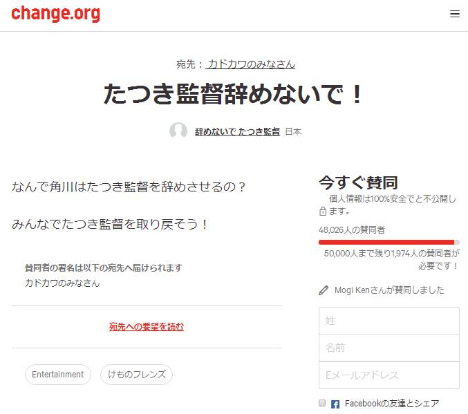 于是有人在公益请愿网站change.org上发起了“たつき监督不要走”的投票,仅用了一天多的时间就已经获得了近50000的支持者。
