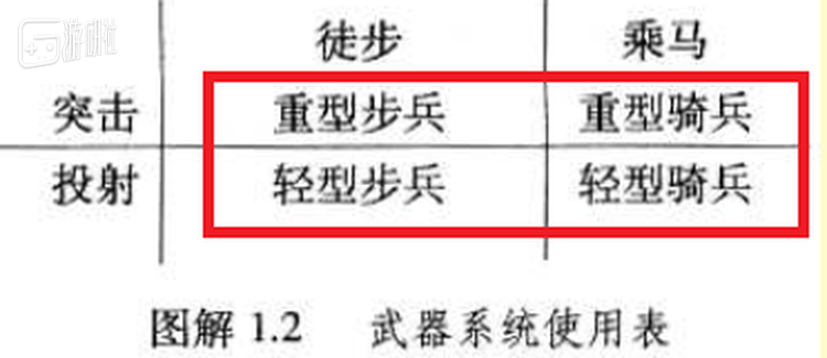 和绝大部分战争史著作习惯从谋略和非确定因素来剖析战争进程的写法不同的是,阿彻·琼斯更倾向于从武器装备的角度来讲解战争中实力的对抗。他将以冲击为主要攻击手段的称为“重”,以投射为主要攻击手段的称为“轻”,进而划分出了红框部分的四个武器系统: