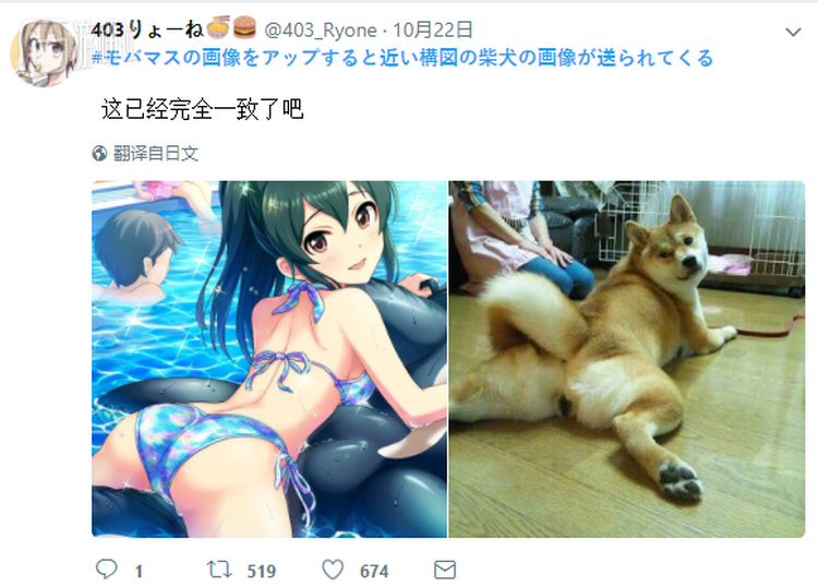 现在在推特上搜索“#モバマスの画像をアップすると近い構図の柴犬の画像が送られてくる”这个标签,能搜到大量相关的相关作品,这不仅要归功于柴犬们的好颜艺,当然还得谢谢偶像大师里的小姐姐们给大家提供素材,毕竟“我的老婆们太多了,哪一个都很可爱啊。”