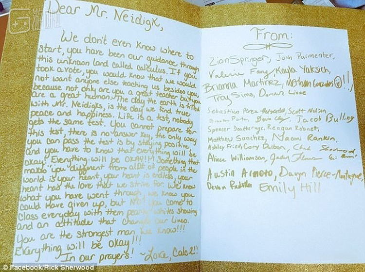 所以当Neidigk又一次因照顾儿子而请假一周之后,这些学生们决定为老师做些什么,以表达他们的感谢和鼓励。