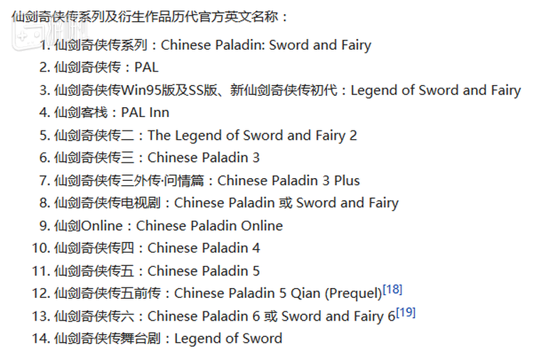 不过话说回来,虽然游戏没出过英文完整版,但仙剑其实是有官方英文名的,只不过各个时期都不一样,十分混乱。