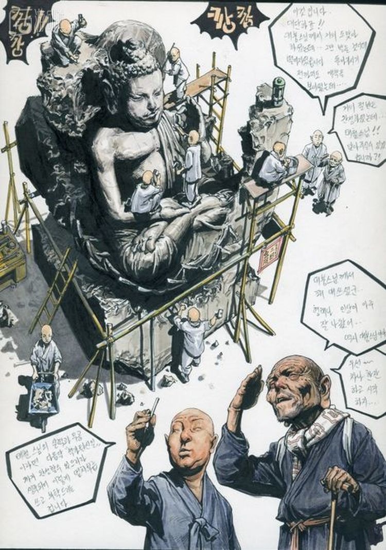 别以为他只会画这种“正经”东西,作为一位漫画出道的画家,金政基一直以持续产出多种风格的作品闻名。