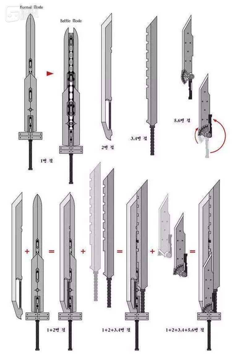 所谓工业、魔法与剑的结合,魔法与剑都很好理解,就是法术和冷兵器,工业代表着一种机械感。图解中的芬里尔大剑,由一把主体(即图中编号1)、三把主剑(编号2、3、4)、两把副剑(编号5、6)组成,组合的方式是机械组合,没有借助除机械学和工程学外的高端科技。借助这一新式武器,《圣子降临》中被萨菲罗斯虐了一整场的克劳德,最后用出的超究武神霸非常得炫酷晒拽吊炸天。第二个要说谁呢,当然是奶挺,呸,雷霆姐啦,虽然表面上在介绍武器,实际上选择的标准还是看脸……雷霆姐战斗中表现实在很配角,让我很难过,六大职阶用A,人员齐整之后我还在用她,就能看出这是真爱了。雷霆姐的武器中,第一把怒火剑能够明显看出工业机械的痕迹。