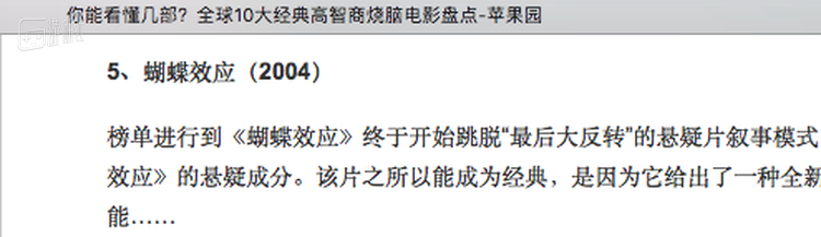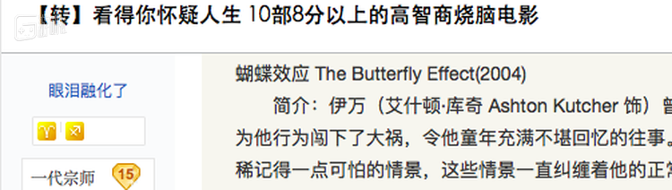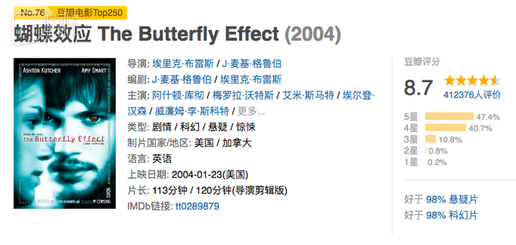 事实上通过时间回溯引发蝴蝶效应改变未来,类似题材的故事已经屡见不鲜。2004年阿什顿·库彻主演的电影《蝴蝶效应》至今仍活跃于各大“电影自媒体”列出的“烧脑电影TOPXX”中,人们对于这部电影的讨论热度从来就没有减退。而在网民阶层兴起、网络话语权越来越开放的今天,这部电影也同它的“烧脑”噱头一道成为网友们标榜自己的必备武器。