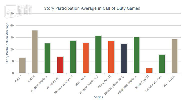 根据TrueAchievements公布的表格,单人战役进度平均值最高的是《COD3》,达到了36%;而《黑色行动3》最低,仅有4%。去年发售的《COD14:二战》达到了29%。单从数据来看,真正耐心打通单人战役的玩家并不多。而《黑色行动3》虽然单人战役进度平均值只有4%,但是这并不妨碍它成为2015年的畅销游戏。