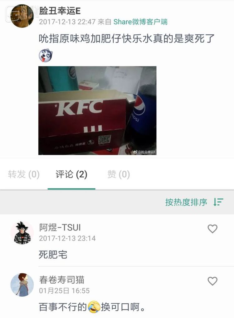 而微博上第一条明确使用“肥仔快乐水”指代可乐的(而且是百事可乐,但底下有人推荐换成可口),其实出自去年12月。整个2017年也只有这么一条。