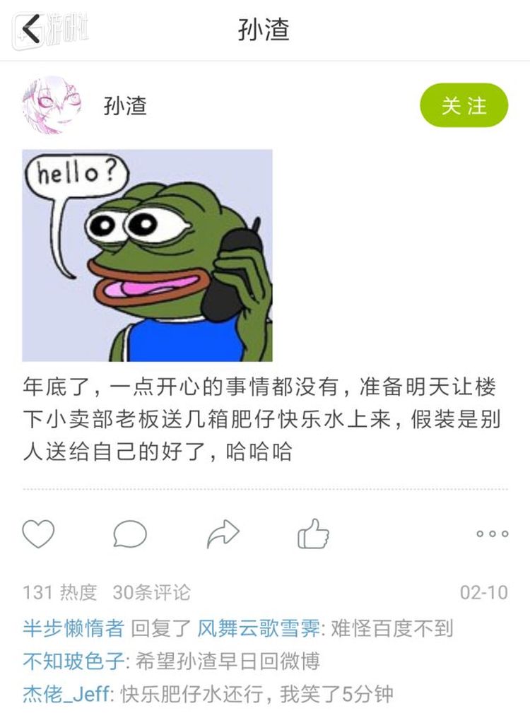 孙渣在2月份发的这连续三条肥仔快乐水,奠定了他在本次肥宅快乐风潮中的重要地位。