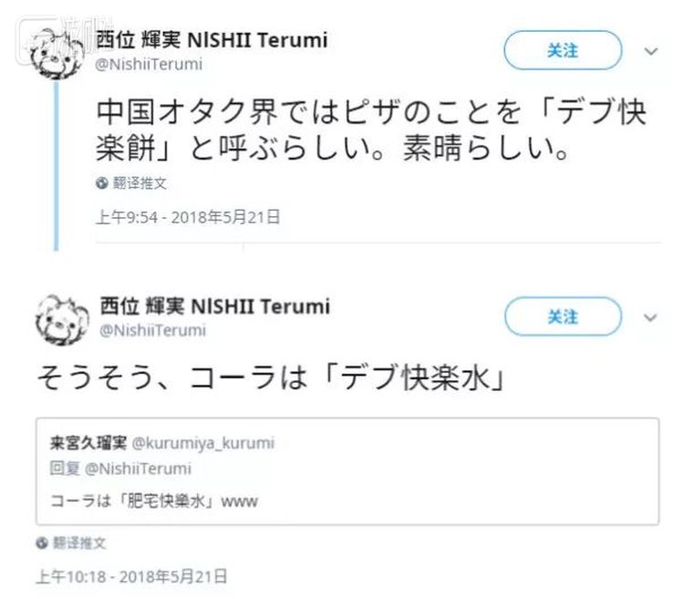 她一回日本,就在推特上发了条感想:“中国御宅界把披萨叫作‘肥宅快乐饼’。真是妙极。”有其他朋友也补充可乐被叫作肥宅快乐水,西位老师也欣然转发。
