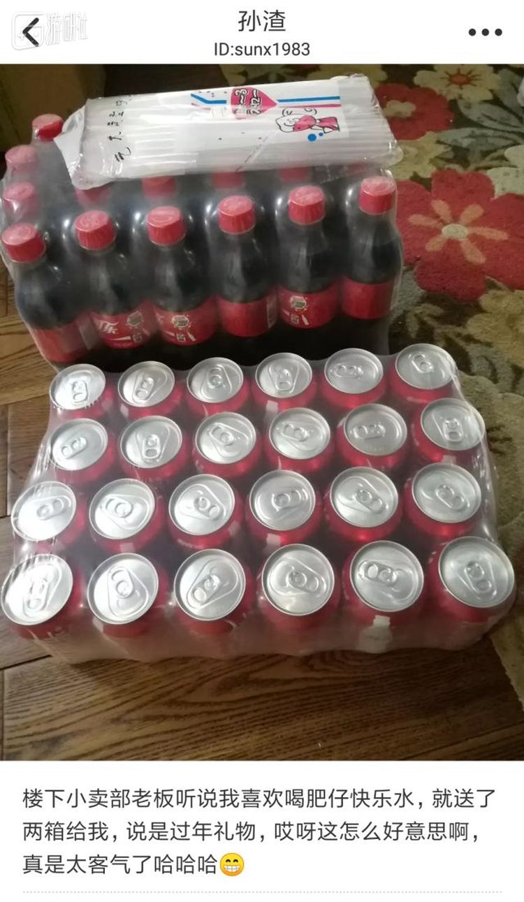 紧接着一天过后,孙渣楼下的小卖部老板就“送”了两箱肥仔快乐水上来,“说是过年礼物”。孙渣很感动,然后收下来发了博客。