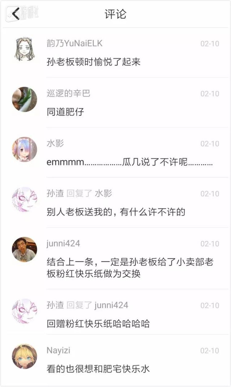 这时候,底下已经有评论误把肥仔快乐水称作“肥宅快乐水”。更有意思的是,一位朋友猜测,“结合上一条,一定是孙老板给了小卖部老板粉红快乐纸作为交换”。