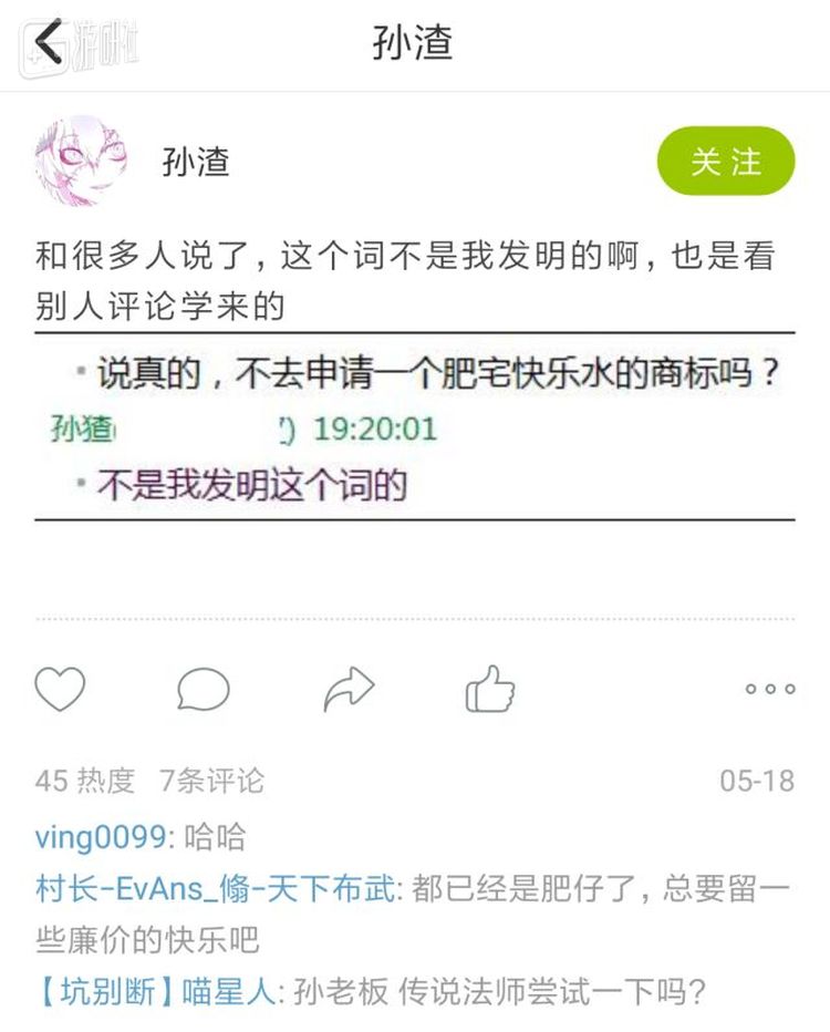 但到了今年5月,肥宅快乐体已经如日中天,此时有人提议孙渣去申请一个肥宅快乐水的商标。孙渣也承认,这并非是由他发明的词语,他自己“也是看别人评论学来的”。