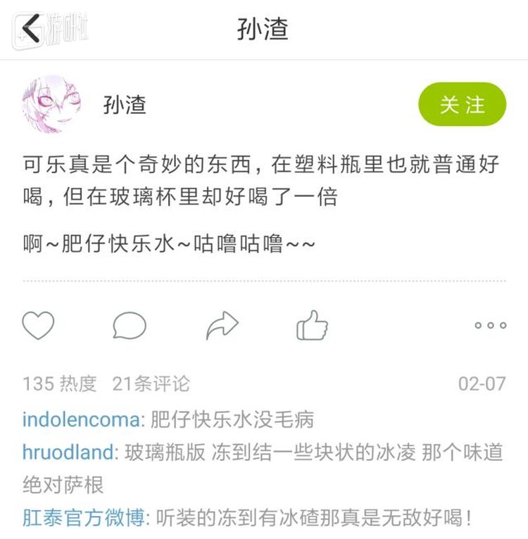 孙渣认为,玻璃杯里的可乐要比塑料瓶里的好喝一倍。底下的肛泰官方微博(真的官方)则提出,听装的冻到有冰碴无敌好喝。总之是在可乐带来快乐这件事上达成了一致。