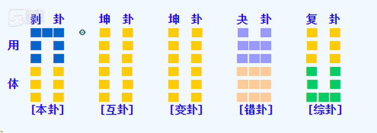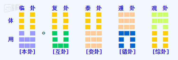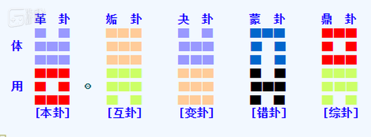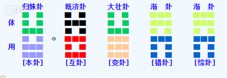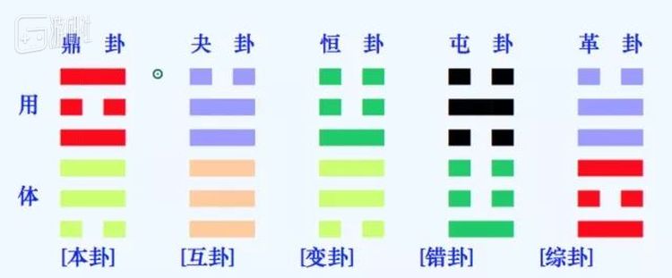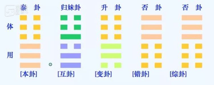 梅花易数以“体卦”作为主体,作为自己,以“用卦”为他人,也为所占卜的事情。另外又分五种卦象: