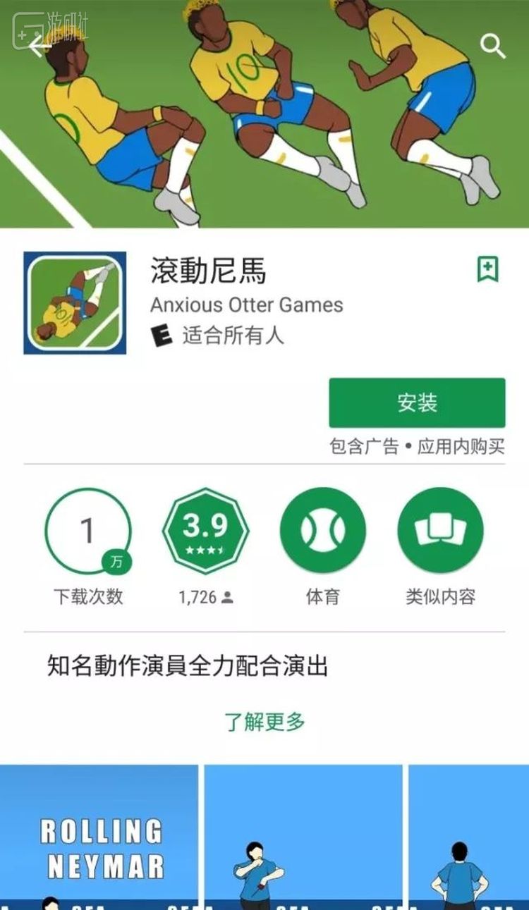 有一家香港的游戏公司也趁着事件的热度在谷歌商店上架了一款“内马尔翻滚”题材的游戏——《滚动尼马》(不方便打繁体的朋友可以搜索Rolling Neymar)。