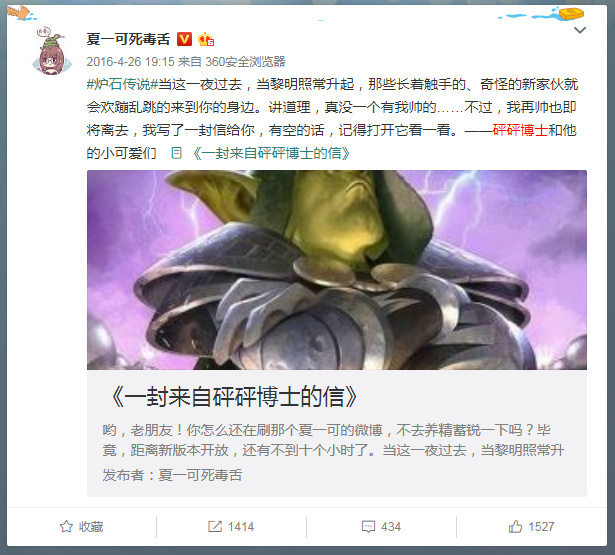 《一封来自砰砰博士的信》不仅在夏一可的微博中出现,它同时也出现在了贴吧、NGA论坛等玩家社区内,“戳中泪点”是玩家对于这篇简短文章的最直接评价。对于游戏而言它无非是一次版本更新,也会有更多更强力的卡牌来代替这个地精的位置,但对于玩家来说这却是一场与老友的诀别。